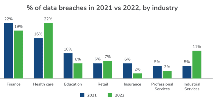 In 2022, healthcare overtook finance as the most-breached industry, accounting for 22% of the breaches handled by Kroll, compared to 16% in 2021
