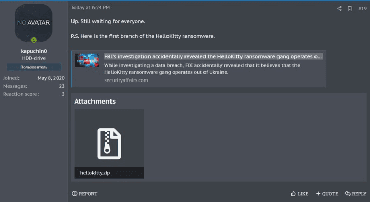The source code for the 2020 version of HelloKitty ransomware has been leaked on a Russian-speaking cybercrime forum by a user identified as ‘kapuchin0’. The leak includes a Microsoft Visual Studio project enabling others to create the ransomware. Despite declaring his intention to develop something superior, the leak could potentially allow other threat actors to develop their own version of the HelloKitty ransomware.